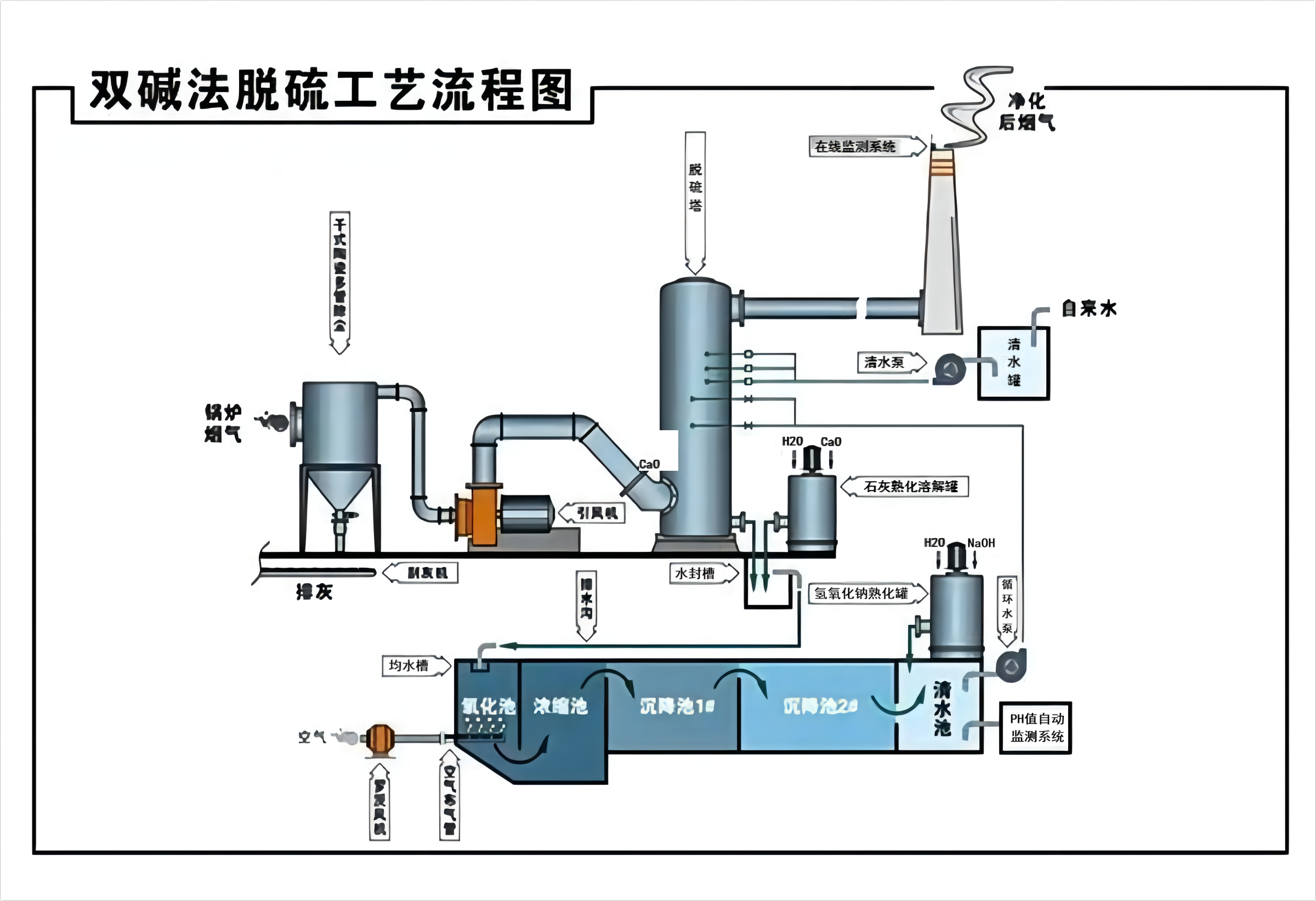 双碱法是采用可溶性的碱性清液作为吸收剂吸收SO2,然后用石灰乳对吸收液进行再生,由于在反应和吸收液处理中,使用了不同类型的碱,故称为双碱法。钠钙双碱法是以莜酸钠和氧氧化钠溶液为第一碱吸收畑气中的SO2,然后再用石灰和熟石灰作为第二碱,处理吸收液。再生后的吸收液送回吸收塔循环使用。系统脱硫效率达到90%以
